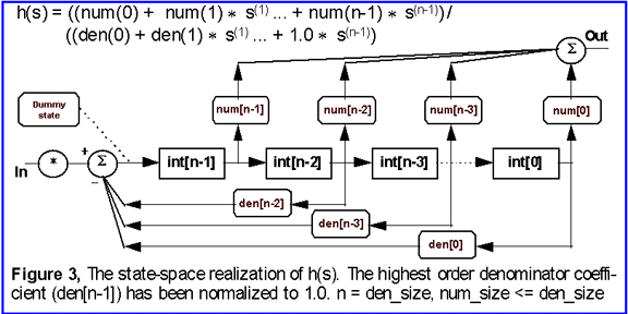 Since there is output at high frequencies, the transform time step must be limited based on the input signal content; that is, the input must have a finite rise time. In SPICE, input rise times are limited to the value of the TSTEP parameter that controls the transient simulation. Simulators typically use this to arrive at the convolution step requirement. For our example, a 1ns step would be typical. The convolution integral, vout = integral( vin(t) h(t-tau) dt ) must be solved for each time step. This amounts to setting up a storage array of time, value pairs which are the impulse response of the network. If the timestep is constant, only values are needed; however, consid- erable space can be saved by separating the values based on content rather than time. This saving also applies to the solution which would have fewer multiply-accumulate operations. Even so, we can expect hundreds of operations per iteration, com- pared with three or four operations in a state space model.