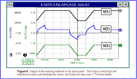On the other hand, the time step used in a state space formulation must be small enough to provide numerical stability. The ISSPICE4 algorithms do an excellent job of automatically adjusting the time step as seen in Figure 5. Using the convolution method, Pspice v6.1 took 10.88s (4890 iterations), while ISSPICE4 took 3.9s (1636 iterations) on a Pentium/60 (Figure 6). The forced time step limiting causes Pspice to be slower than ISSPICE4 by over 275%. You can actually improve on ISSPICE4s internal algorithms by setting the TMAX parameter to about one half the fastest time constant to prevent the continued scaling back that occurs in ISSPICE4 automatically when the timestep become too large. By overriding the automatic TMAX selection, you can reduce the total number of iterations, and therefore, simulation time, by as much as 50%. For the lead lag example, this means dropping from 1636 to 987 iterations.